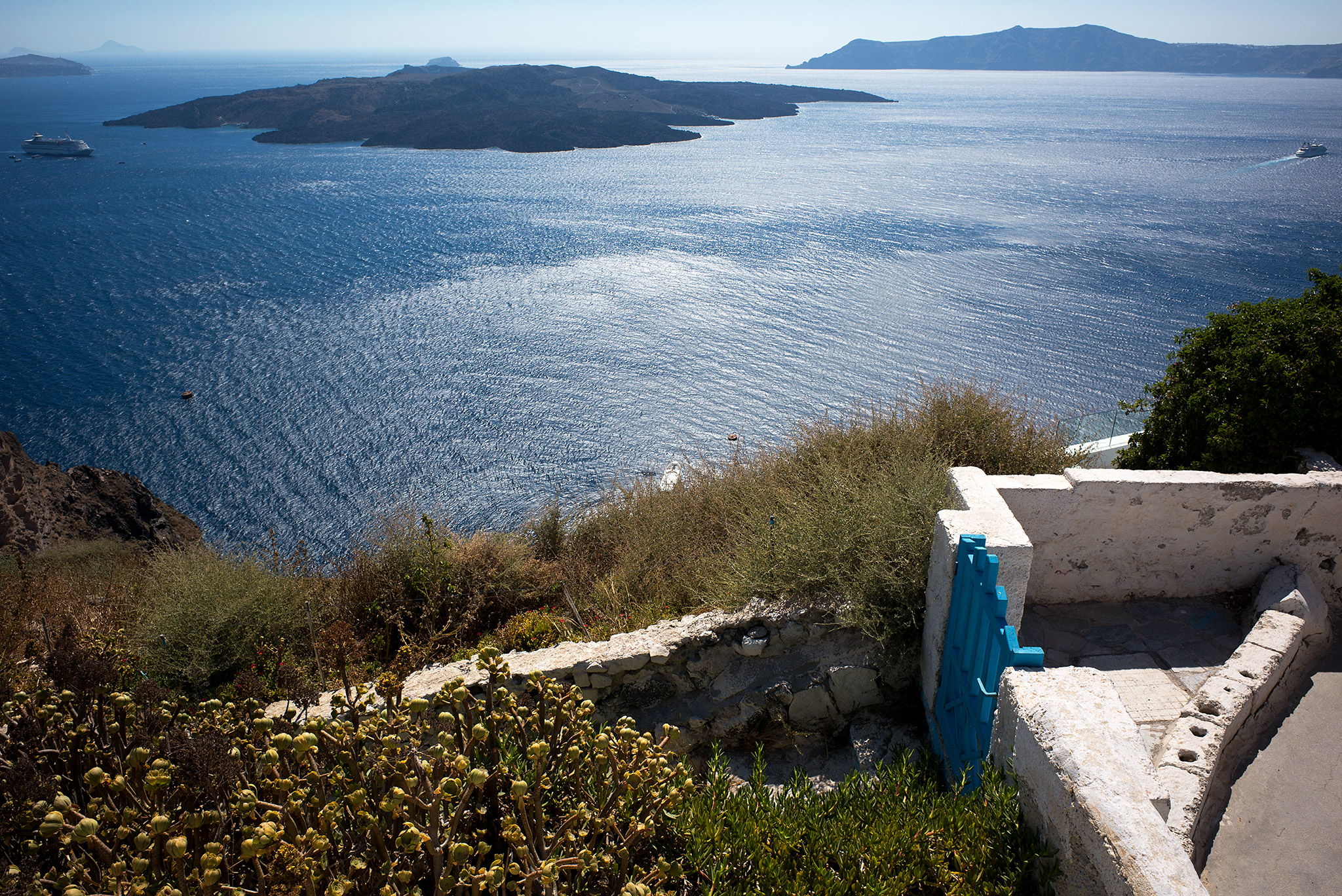 Ένας περίπατος με τα πόδια είναι πιθανότατα ο καλύτερος τρόπος για να βιώσει κανείς τη γοητεία της καλντέρας σε όλη της την ένταση. Το παλιό μονοπάτι που συνδέει τα Φηρά με την Οία, και το οποίο χρησιμοποίησαν ανά τους αιώνες έμποροι και αγρότες, περνά από διάφορους γραφικούς οικισμούς και από σημεία μοναδικής θέας. Ένα δίκτυο μονοπατιών συνδέει μεταξύ τους άλλους οικισμούς του νησιού καθώς και σημεία φυσικής ομορφιάς και προσφέρεται τόσο για χαλαρή όσο και για οργανωμένη πεζοπορία.