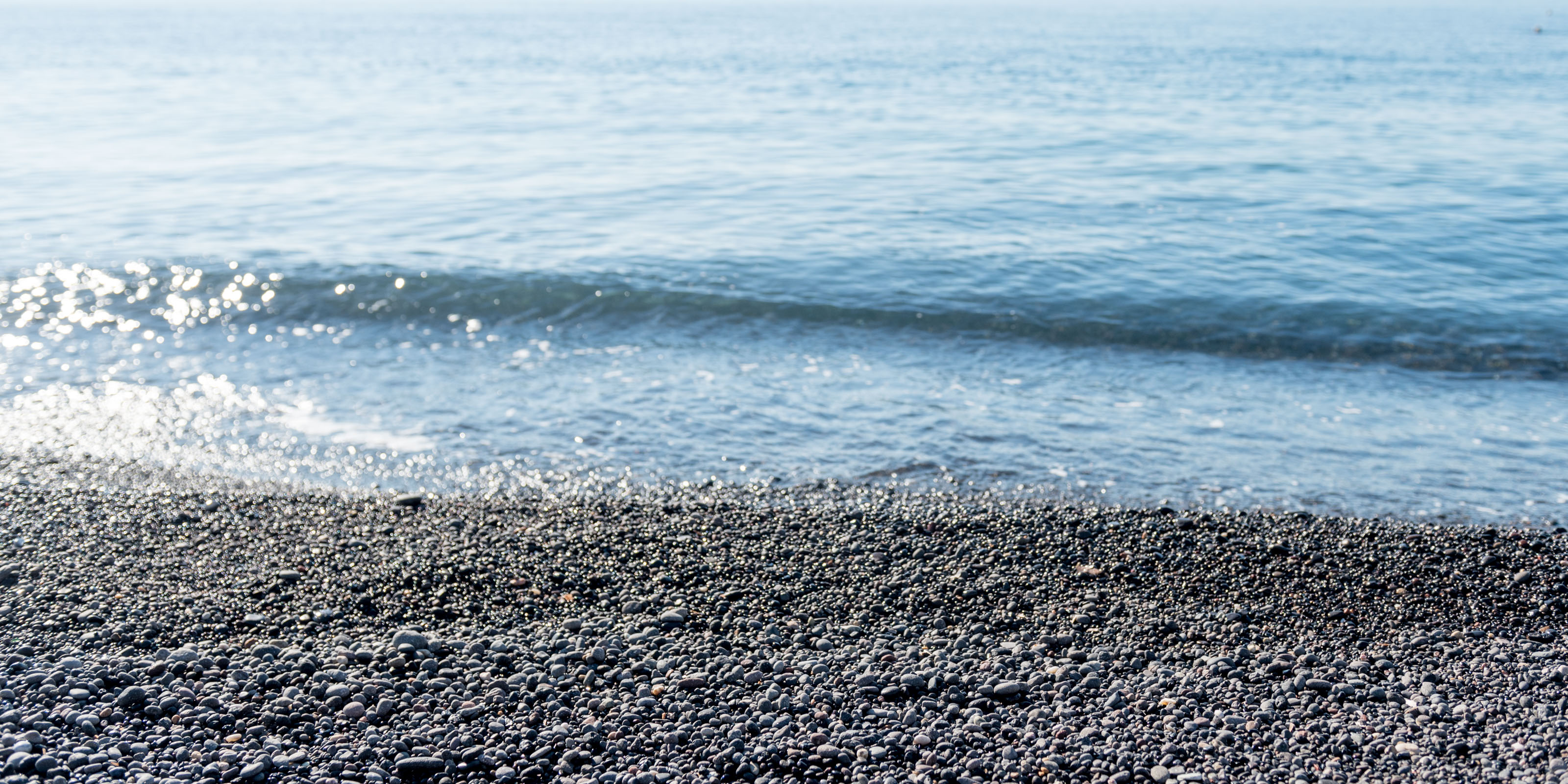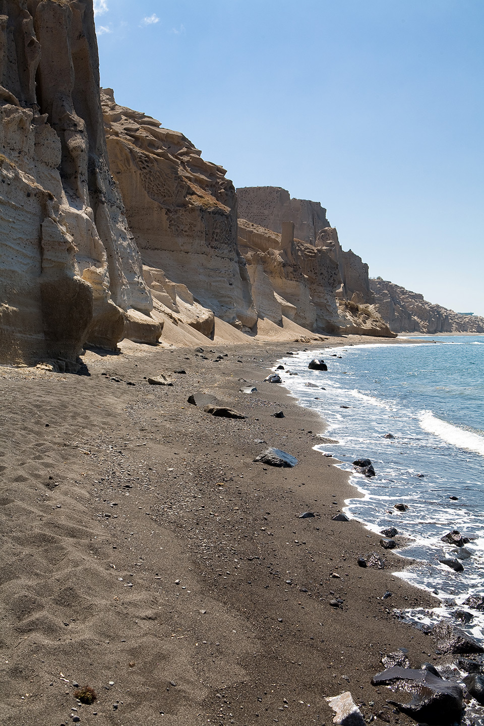 Μοναδικές ηφαιστειακές μορφώσεις πλαισιώνουν μια μεγάλη παραλία με μαύρο βότσαλο.